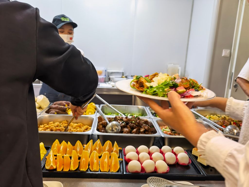 全体员工享受了一顿丰盛的午餐,不仅有红烧排骨、白灼大虾等硬菜,还有多种甜品和水果可选。大家井然有序排好队伍自助取餐用餐。“菜品很丰富,味道也很好。”“有了自己的食堂,就再也不用点外卖,去隔壁公司食堂搭伙了,实在是太幸福了。”用过餐后,员工们纷纷对餐厅的菜品表示点赞。