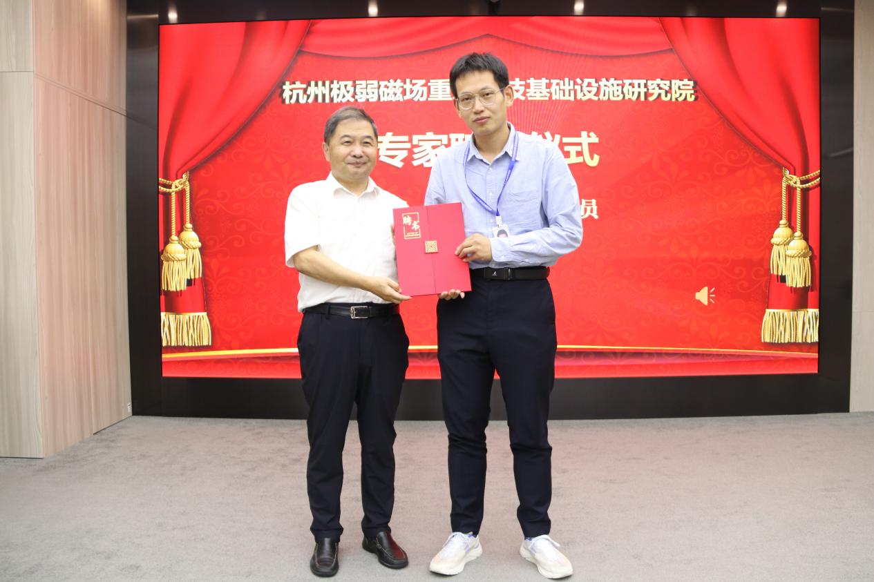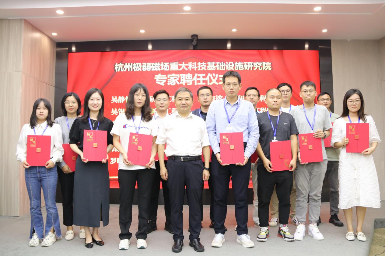 9月15日下午,杭州极弱磁场重大科技基础设施研究院举行了第五期聘任仪式。中国科学院院士、杭州极弱磁场重大科技基础设施研究院首席科学家和总设计师房建成,中国科学院院士江雷,中国科学院院士顾宁出席聘任仪式,研究院常务副院长、副总设计师、大型磁屏蔽研究所所长韩邦成主持聘任仪式。