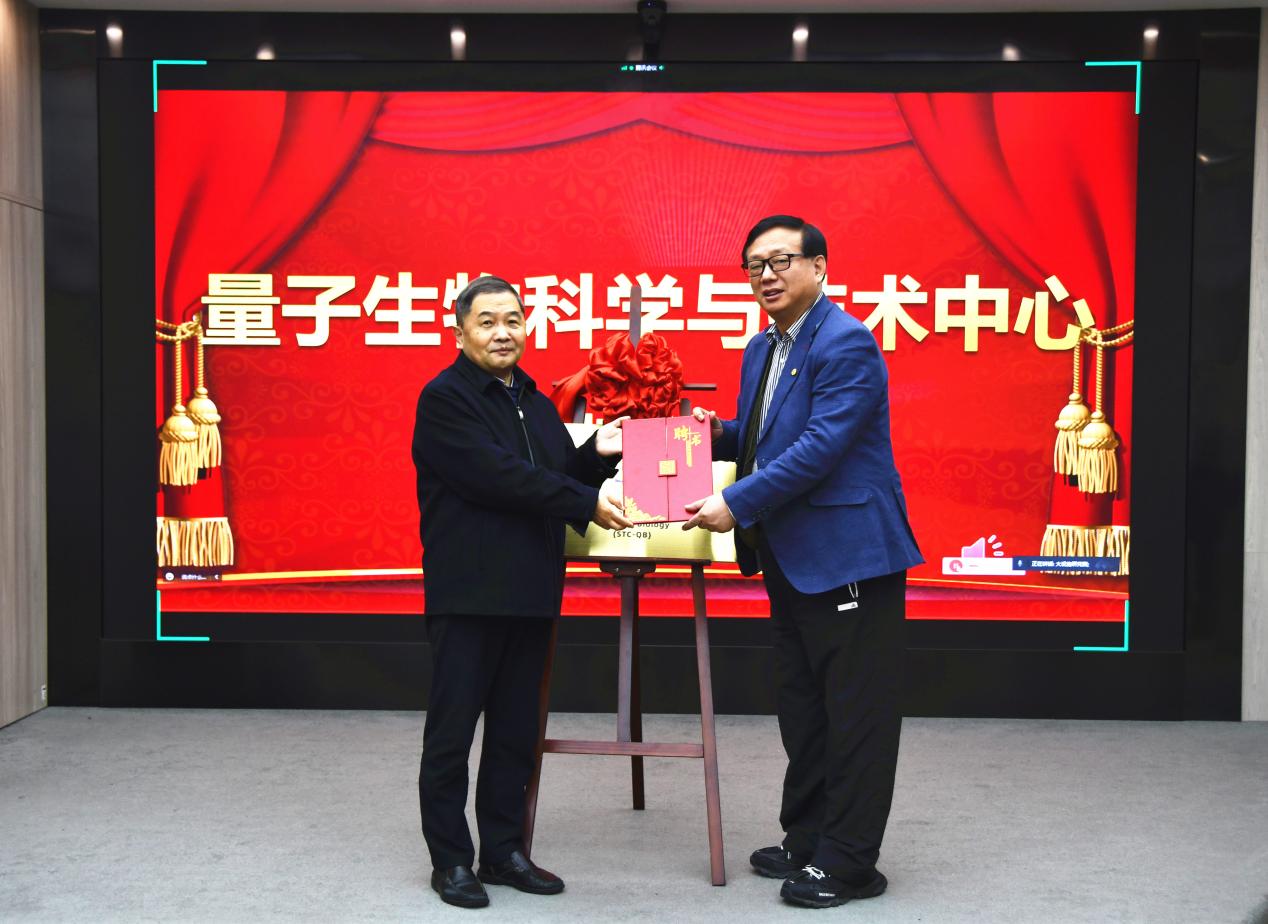 房建成院士为江雷院士颁发了量子生物科学技术中心主任和首席科学家聘书。