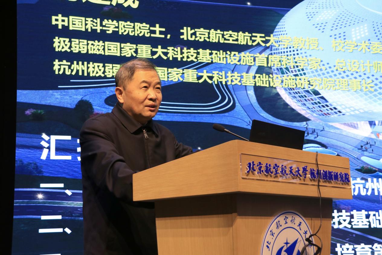 随后,房建成院士作了题为“建设天堂硅谷国之重器,打造国家战略科技力量”专题报告。房院士在报告中首先回顾了他带领北航团队落地杭州、扎根杭州、建设杭州的历程。接着房院士系统介绍了国家“十四五”的极弱磁场国家重大科技基础设施对科学发现、技术创新和产业培育的重大意义和作用。对于极弱磁大科学设施的发展愿景,房院士展示了建设零磁科学谷的宏伟设想——汇聚全球的顶尖科学家,牵头发起国际零磁大科学计划,并推动创新链和产业链深度融合发展。